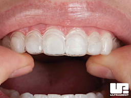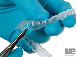 With small tactile scissors (e.g. Ultradent™ Ultra-Trim Scalloping Scissors), carefully and precisely trim the tray to the clear line which is at the gingival height. Scallop edges to avoid contact with gingival tissue.