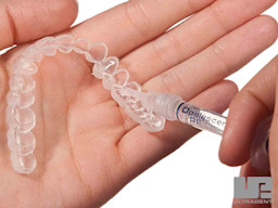 Review enclosed instructions with patient to brush teeth and explain the process of loading the tray by expressing one continuous bead of gel approximately halfway up from the incisal edge on the facial side of the tray from molar to molar. Explain that this should use about 1/2 to 1/3 of a syringe.