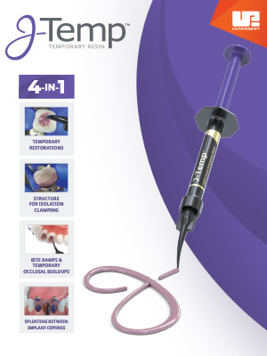 J-Temp temporary resin was developed by Ultradent’s own Dr. Jaleena Fischer-Jessop to better meet the wide variety of needs that clinicians face. It is a radiopaque, light-cured, flowable, methacrylate-based resin that provides a durable—yet temporary—material for multiple uses such as temporary restorations, tooth buildups, and more.
