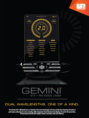 Gemini soft tissue diode laser delivers advantages of 20 watts of peak super-pulsed power for faster and gentler cutting, dual wavelengths for clinical versatility, and an adapter for incorporating the benefits of photobiomodulation.3