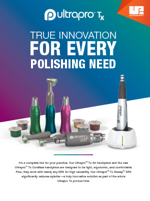 Ultrapro Tx disposable prophy angles are an essential component for every practice. Their ergonomic shape helps reduce hand and arm fatigue,1 and their patented gear design ensures smooth function. They are available in Original, Extra, Skini, and Sweep prophy angle types. And with firm or soft cup options for each prophy angle type, you can ensure you get the right cleaning power for each patient.
