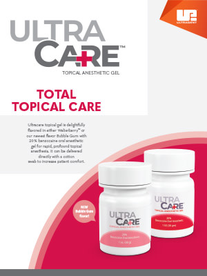 Ultracare Topical anesthetic gel is an effective 20% benzocaine oral anesthetic gel for fast, effective, and profound topical anesthesia. It is available in 1 oz bottles and can be easily delivered directly using a cotton swab to increase patient comfort. Great tasting and with no bitter aftertaste, Ultracare Topical anesthetic gel is available in two great flavors your patients will love—Ultradent's famous Walterberry flavor and our new Bubble Gum flavor!